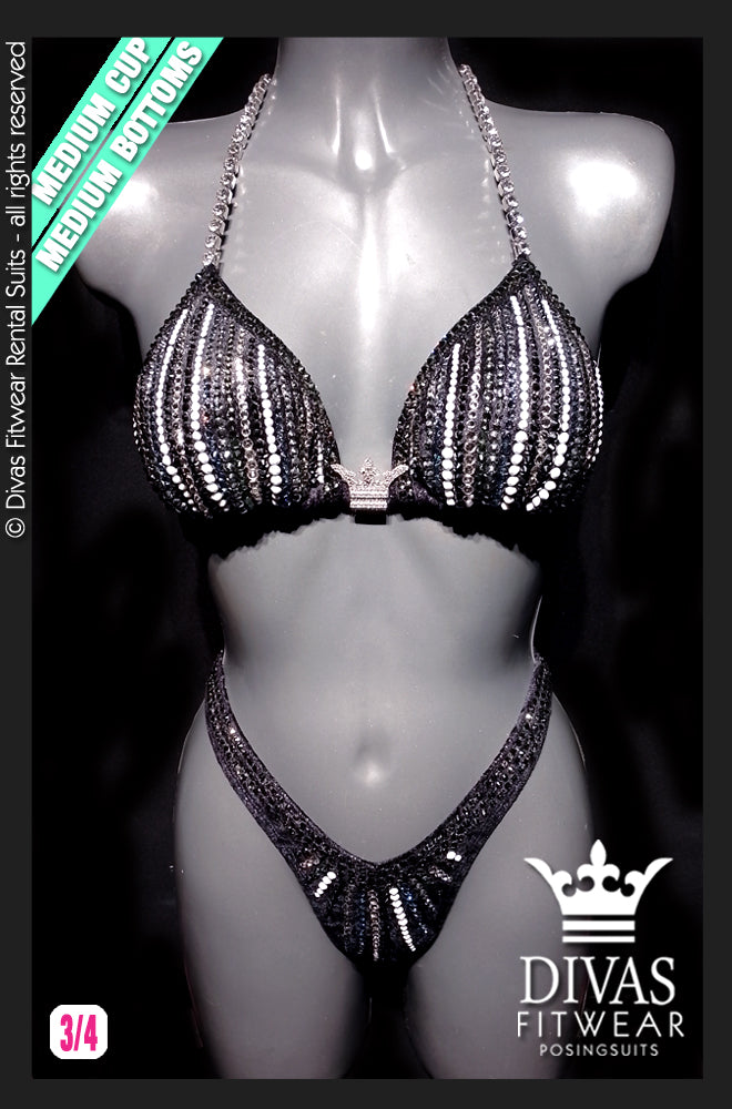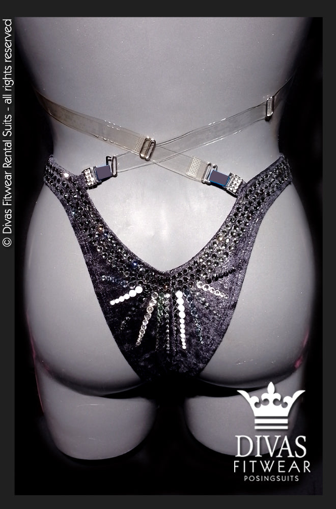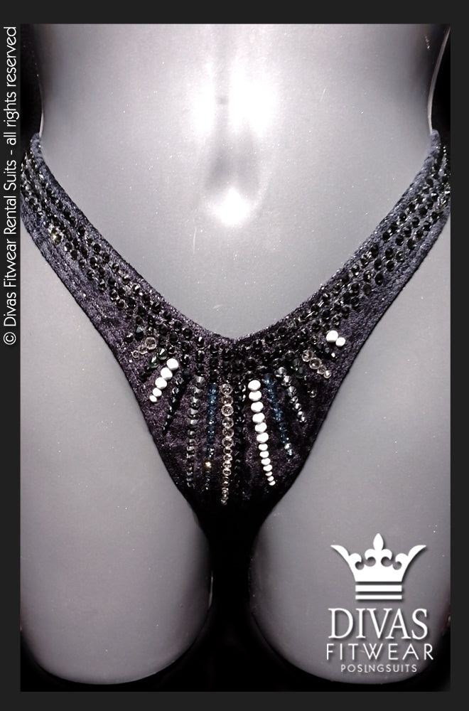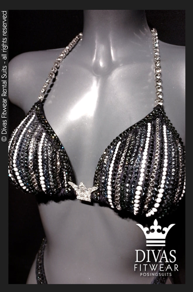 The suit is completely set in Divas Rhinestones Eltanin Rose premium glass crystal, 16 facet cut rhinestones in colours Solid White, Jet Hematite, Purple Ghost, Crystal, Black Diamond with a double outline in Black Diamond on the top and triple on the bottoms.