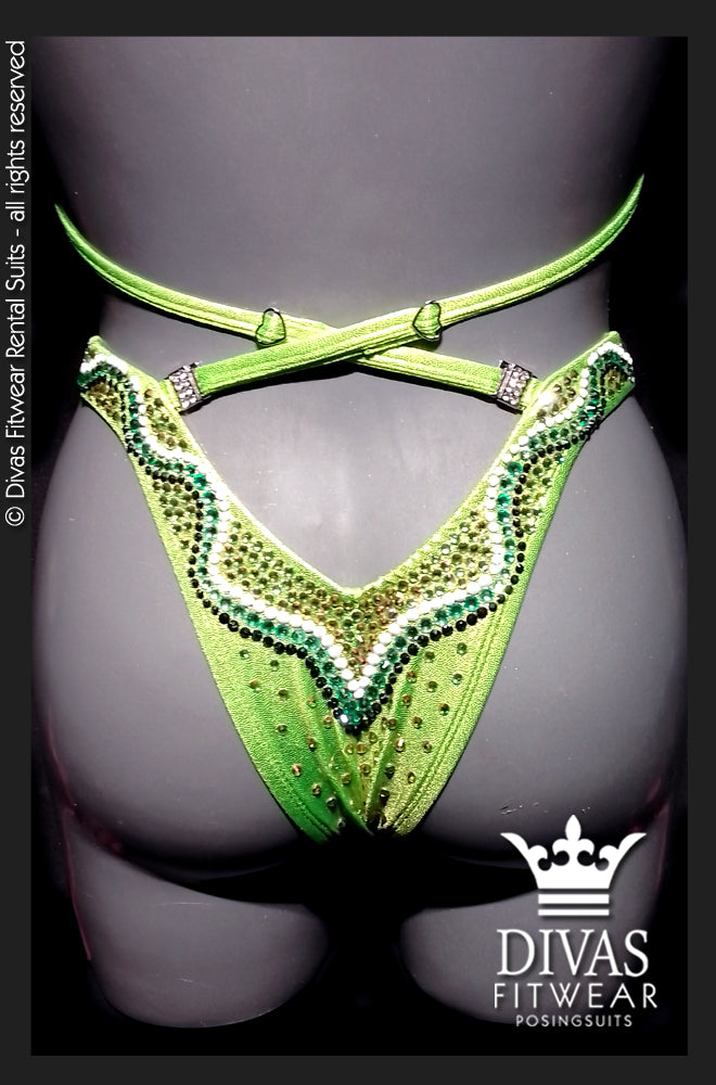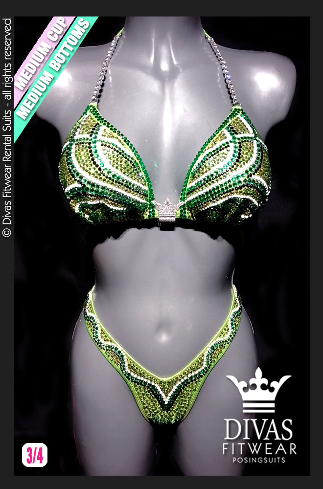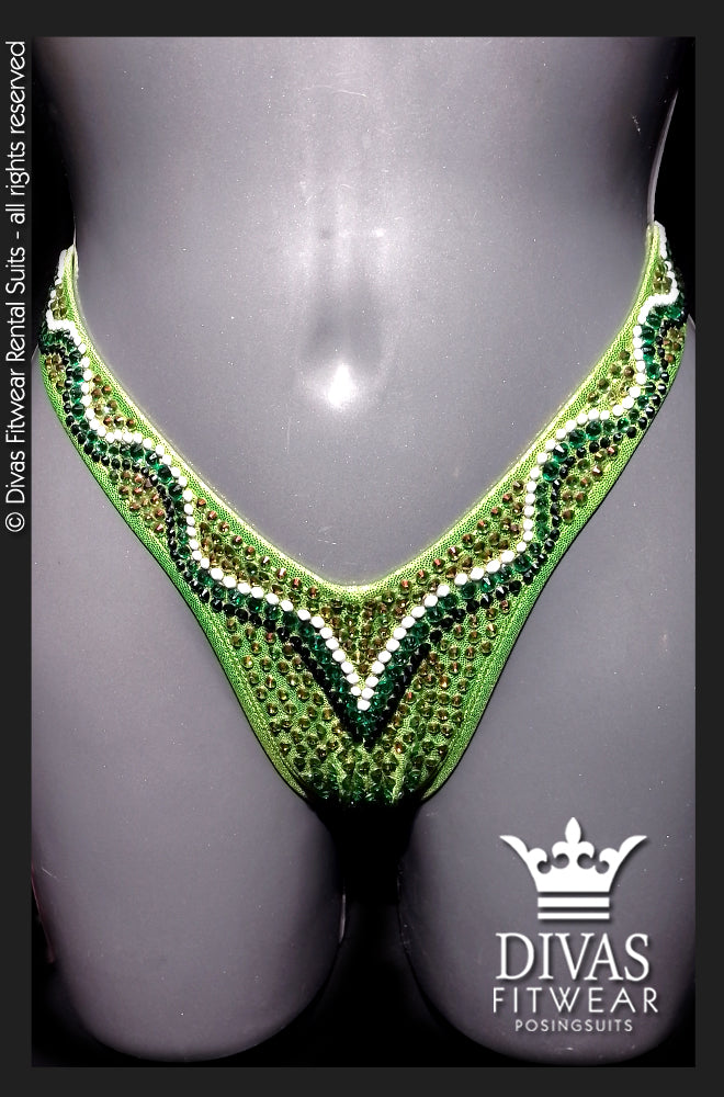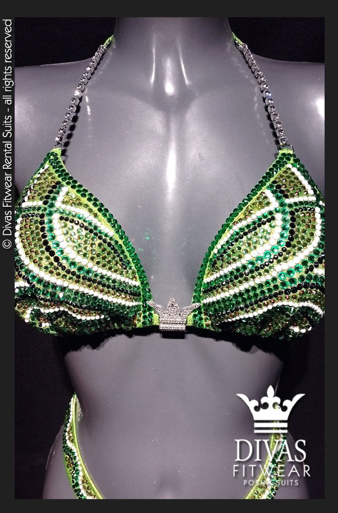 The suit is completely set in Divas Rhinestones Eltanin Rose premium glass crystal, 16 facet cut rhinestones in colours Jet Black Shine, Peridot, Solid White, Peridot Light with a double outline in peridot on the top.
